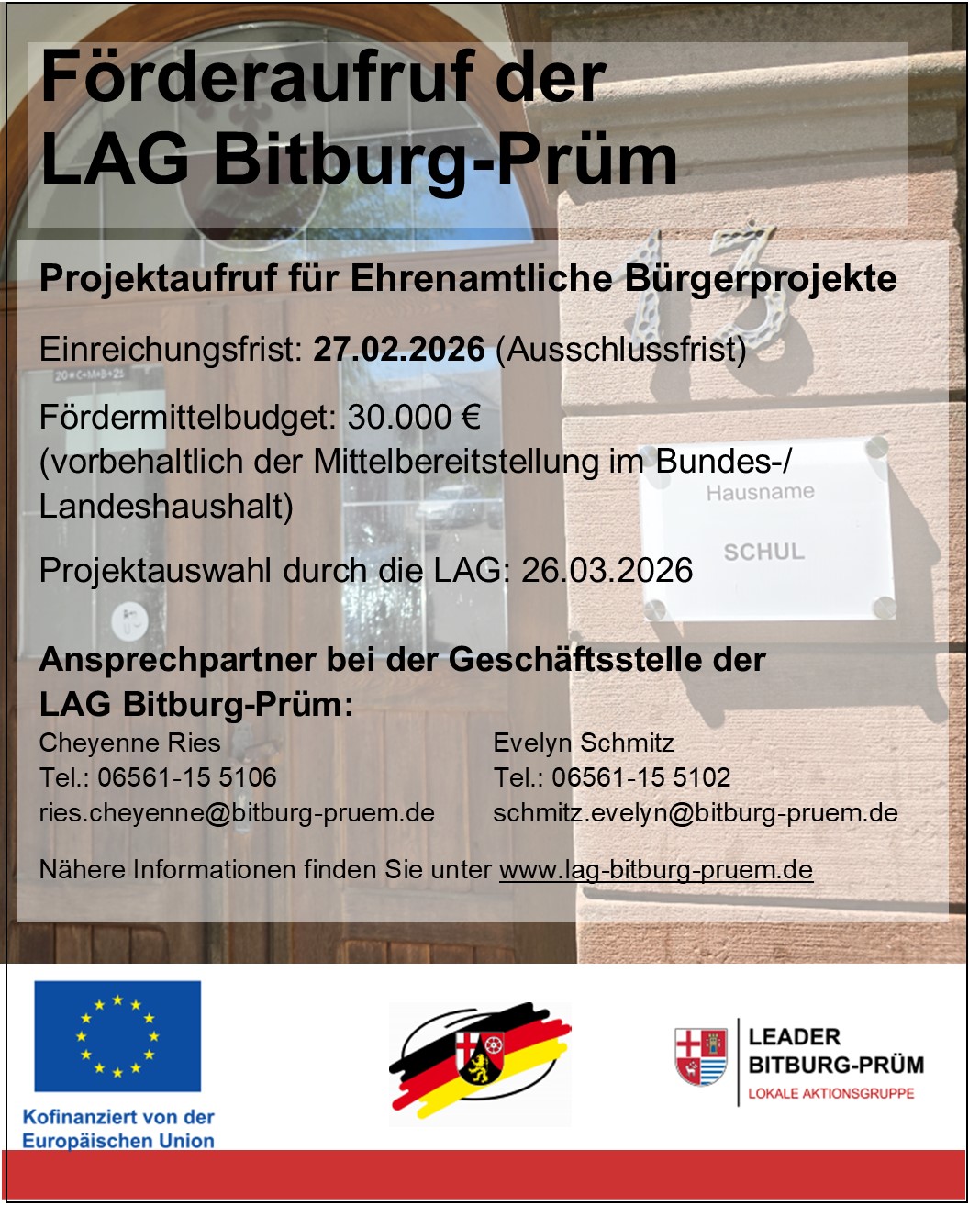 Ansprechpartnerin in der Geschäftsstelle der LAG Bitburg-Prüm ist Cheyenne Ries, Tel. 06561 15-5106, ries.cheyenne@bitburg-pruem.de.
